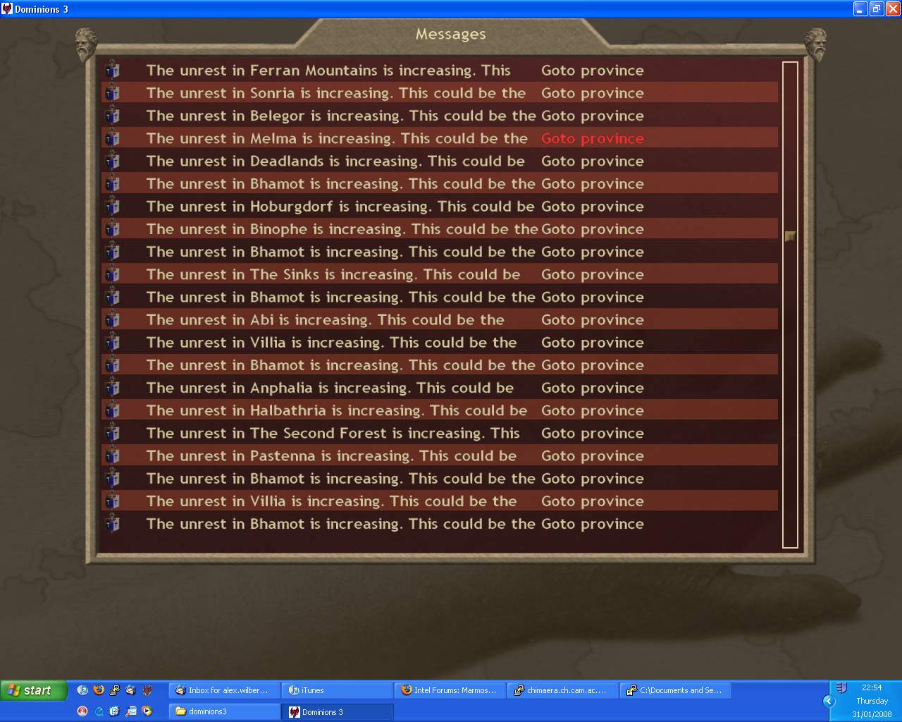 In Bandar nothing happened. My SCs claimed a couple more provinces. Considering Tyrant's comment about SCs above I wonder whether my original plan to attack Man and TC mainly with armies, and Bandar mainly with SCs was a good one.