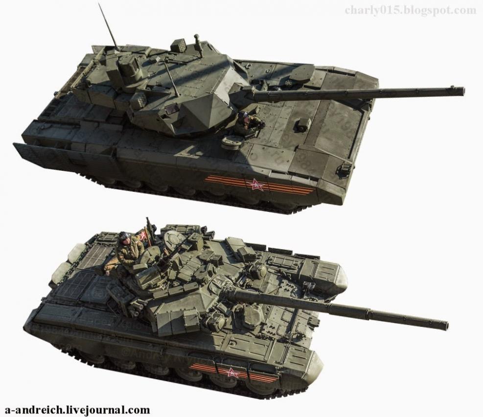 First is a comparison of T-14 Armata and T-90A shot from the same angle -- it clearly shows that the Armata is a different combat chassis from the T-72/T-90 family -- the road wheels also are different.