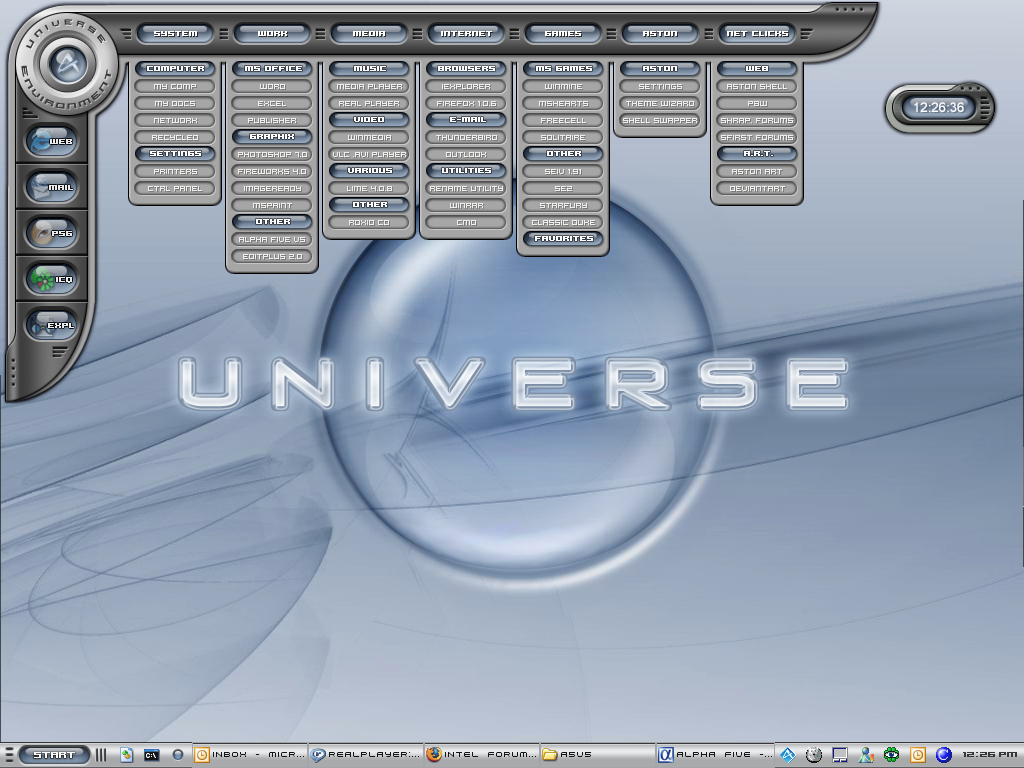 Here is mine. It is still going through some modifications. Along with the menus on top, I have pop-out menus on each side of my screen to access even more programs.