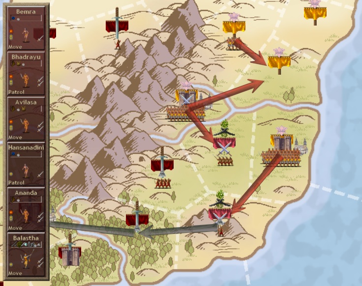 What is important, and exciting, is that if all goes according to plan I will crush T'ien Ch'i's remaining forces next month, and his so-called 'god' will be banished forever from this realm. This shouldn't be hard: as far as I can tell he only has two provinces left, both adjacent to provinces I hold. Balastha will attack one and Bishen the other (with appropriate forces of course). Then the name of Di-ya, the abominable god of T'ien Ch'i, will be blotted out forever; the so-called Patron of Necromancers will become the plaything of death itself; the pretentious Turner of the Flood will be swept away by the mighty flood of my armies; the much-vaunted Lord of the South Wind will be blown away and the pathetic Lord of Terror will become a by-word of terror to the enemies of Kailasa!