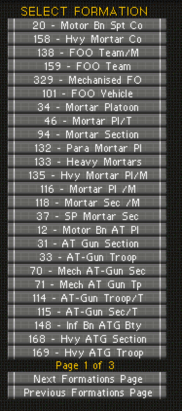 For example. with this new routine if you go into the artillery page you will generally find that Forward observers are the first formations listed then generally if there is consistency to the first unit in the formation you will find the light mortars, then the medium mortars then the heavy mortars then the AT guns, then the Hvy AT guns through field guns into rocket formations, off map guns and finally AA guns. Again...its all determined by the first unit in the formation but in the past ( and the free game will still use the original method ) you may have had a one type of infantry company with unitclass #1 infantry as the first unit but the second type of infantry company may have had a unitclass # 64 Medium Infantry unit leading to in some cases a dogs breakfast of the sort order. A good example of that was the winSPMBT Russian OOB in the years that the T-55 and T-62 unitclass #13" medium" tanks were active along with the T-64 and up unitclass #59 "MBT" formations but the lower end Mediums were on page one and the higher end MBT's were on page 2. With this they are all grouped on page one and we think this will help bring a bit more order to the game